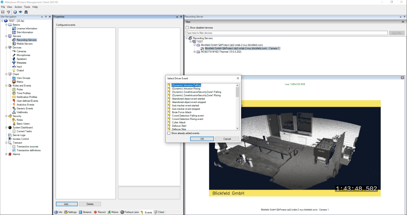 The live video stream of the QbProtect point cloud can be accessed and observed in Milestone XProtect Management Client after succesfully completing the required steps above.